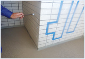 傷んでいる外壁タイルを調査して、補修する箇所をマーキングしている写真。