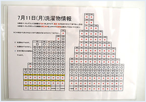 工事業者による掲示。洗濯物が干せる日が、部屋ごとに〇×でお知らせされます。