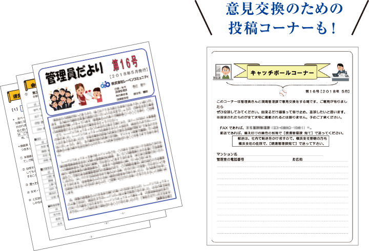 「管理員だより」は、管理員の意識を高めるために手作りしている機関紙です。企業としての伝達事項のほか、管理の現場でおこるさまざまな事例を共有化し、より良い管理に取り組む方法を考える役割を担っています。たとえば「掲示物の見やすい掲示法」を提案したり、「管理員業務マニュアル」の内容を深掘りするコーナーも。また、投稿コーナー「キャッチボール」はさまざまな事例に対して、解決法や意見を交換する場となっています。レーベンコミュニティでは、高品質な管理員の育成を目指し、これからもこのような取り組みを続けてまいります。