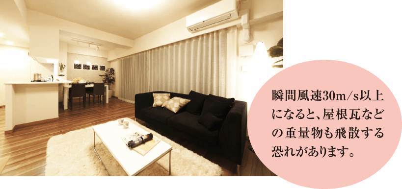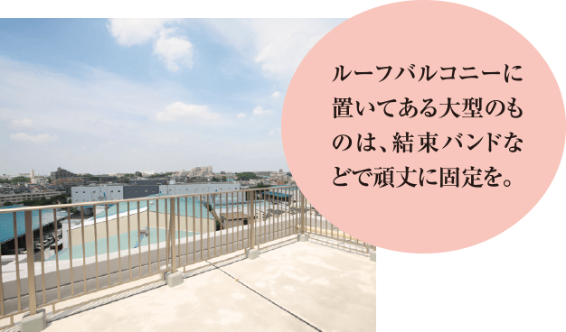 ベランダ内に置いたままになった物が強風で飛ばされ、隔て板が破損する被害も発生しています。そもそもベランダは大きなものを置くのが禁止のため、賠償責任が発生する可能性もあります。そうならないために、ベランダのものはすべて屋内に入れるのが安全です。