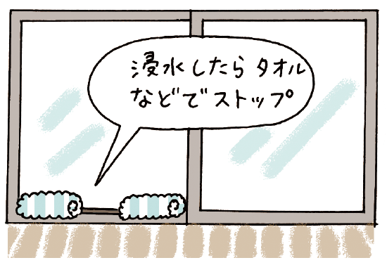 引き違い窓は、台風時の横や下から吹き付ける風により浸水することがあります。水が室内に入ってくるようなら、防水テープで留めるのが有効です。防水テープがない場合は雑巾を浸水カ所に詰めて水浸しになるのを防ぎましょう。