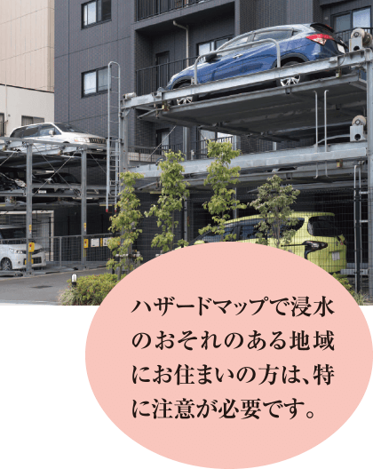ピット式機械式駐車場では、集中豪雨や台風などの際にピット内に水があふれ、車両が冠水してしまう事故が発生しています。豪雨の予報が出たばあいは、駐車場から車両を出しておくのが安全です。