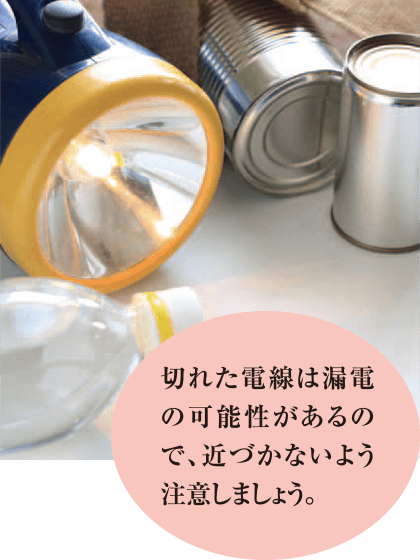 暴風雨のなかを外出するのは危険です。不要な外出はひかえ、家で過ごせるような準備をしておきましょう。また、台風による停電・断水被害も予想されます。万が一のときのために、ランタンや水などを用意しておくと安心です。