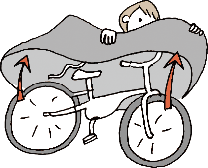 自転車のカバーは風を受けてしまうのではずします。また、自転車置き場と駐車場が近いマンションでは、風で自転車が引きずられ車にキズを付けてしまうこともあります。自転車はロープなどで固定しておきましょう。