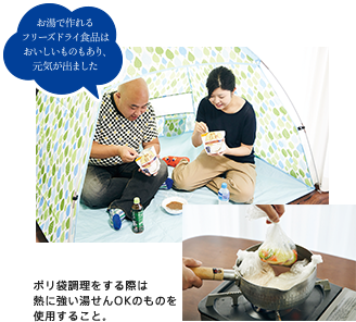 体験された笈西様ご夫妻は、上で紹介した以外にも「災害用トイレは意外に臭いが気にならなかった」「野菜が食べたくなった」「お風呂に入れないのは想像以上につらい」など、実感したことがたくさんあったといいます。旦那様は「大変な環境を経験してみて、妻を大切にしなければと思いました」とも。家族の絆を見つめ直すきっかけにもなったようです。備えあれば憂い無し。もしものときのために、ぜひ体験してみてください。