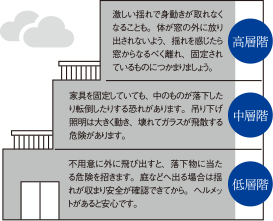 マンションは高層階ほど揺れが大きくなります。そのため、居住階をふまえて対策を考えましょう。マンション被害の事例として、耐震でないドア枠などの変形による閉じ込め、停電によるエレベーターやオートロックの停止、上下水道・ガス管・送電設備への被害によるライフラインの停止などがあげられます。建物の接合部(エキスパンションジョイント)にヒビが入っているところは、接合面の落下の可能性もあるので、注意が必要です。