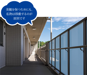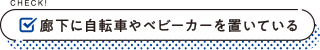 ベビーカーやショッピングカートなどは、つい共用廊下に出しておきがち。アルコーブに入れているから問題ないと思っている方も多いかもしれません。しかし、大きな地震の際には、横倒しになったり、振動で廊下に飛び出したりして、避難しづらくなることがわかっています。また、共用廊下に物が多いマンションは、資産価値が下がるともいわれています。